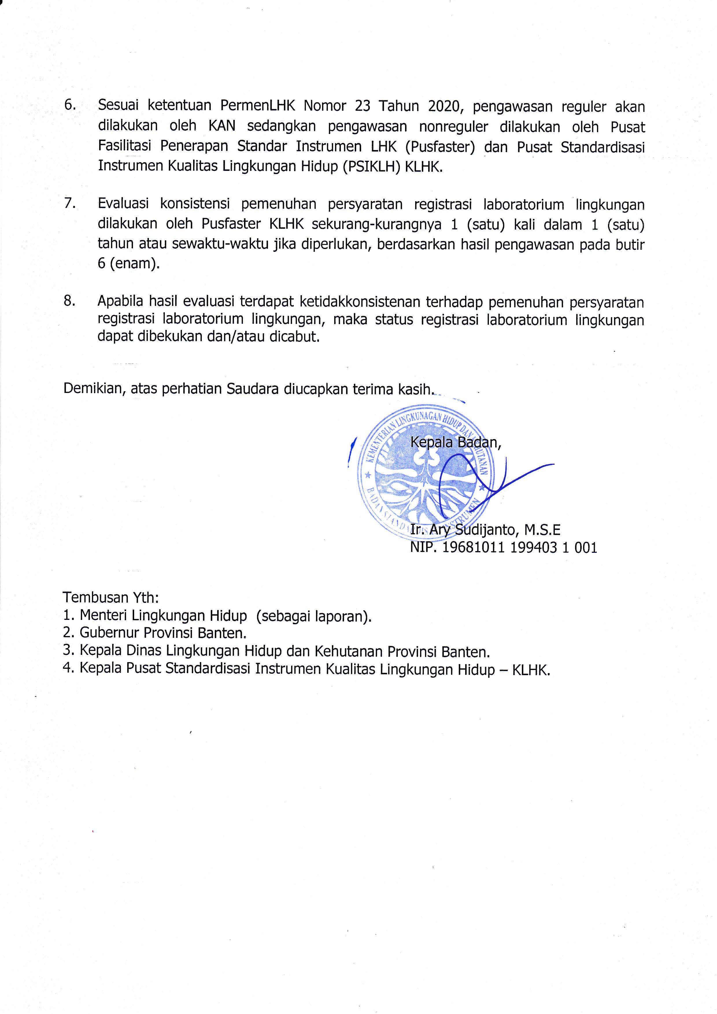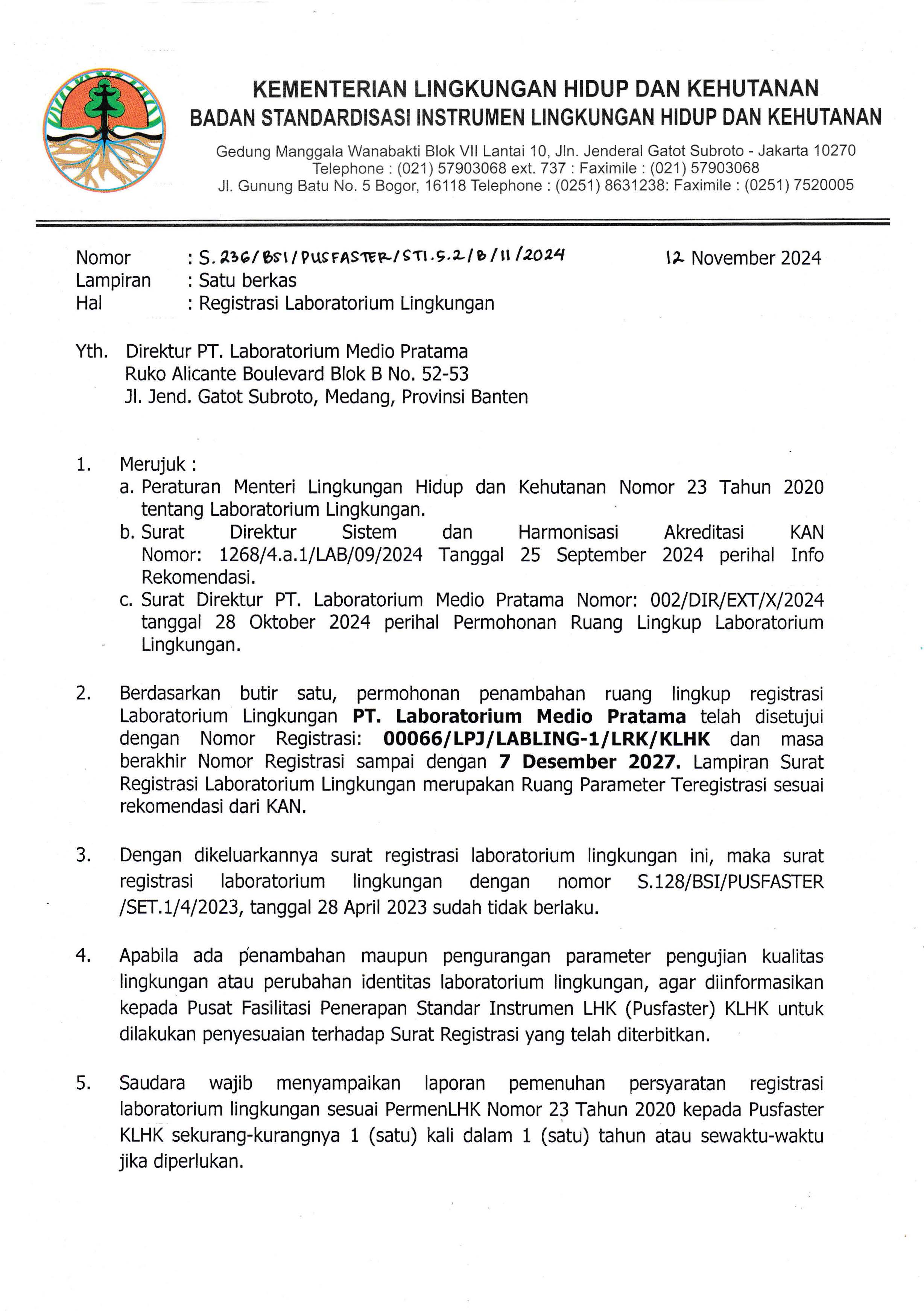 Rekomendasi Laboratorium Lingkungan Hidup No. 00066/LPJ/LABLING-1/LRK/KLH.